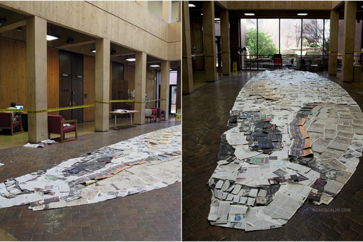 As an ode to his skull-a-day project which brought him back to his creative calling, Noah Scalin‘s latest art installation at Wichita State University in Kansas is an anamorphic skull created with newspapers. Though not particularly planned, the installation came at a perfect time as word came around that the local newspaper will no longer be in print and will soon be switched to a digital format. Aptly named ‘Dead Media 5,’ the project is part of the Dead Media series where Scalin uses outdated media such as CD’s, VHS tapes, and records to create site-specific anamorphic skull installations.
