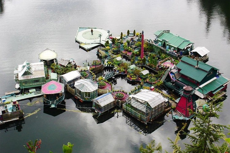 Wayne Adams and Catherine King built their “Freedom Cove” off the grid in 1992 and it’s been evolving ever since. Consisting of 12 floating platforms that include a gallery, dance floor, art gallery and five greenhouses, the Vancouver settlement has half an acre of land for growing sustainable crops.