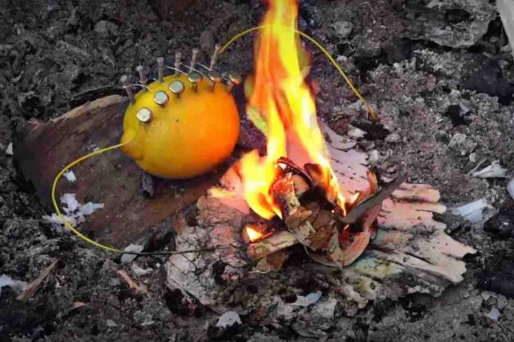 Though we wouldn’t count on bringing a lemon if our audition tape ever gets selected for Naked and Afraid, this nifty little trick is still pretty awesome to know. Be prepared to be fascinated at what a softened lemon, copper clips, zinc nails, a piece of wire and steel wool can do when you arrange them just so. The sixth zinc nail acts as the positive terminal and the first copper clip is the negative terminal which when brought together, creates an 11 volt short circuit, hot enough to spark a fire. Though we like our magic theory better, the scientific explanation will do just fine as well.