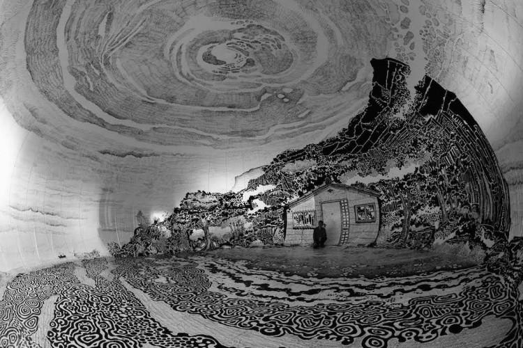 The inside of a 40 foot inflatable dome becomes the site of a massive drawing by Brazilian-born Japanese artist Oscar Oiwa as part of the 2016 Setouchi Triennale. The International Art Festival will be spread across 12 islands in Japan and will include 68 works by world-renowned artists, designers, and architects in hopes of bringing life and excitement to the aging islands. Visitors eager to view the artworks can hop on a ferry from the mainland and learn about the different island’s culture in the process. In order to view Oiwa’s immersive art installation “Oiwa Island 2,” guests will have to walk through a soy sauce factory before finding themselves surrounded by a black and white drawing of a detailed Setouchi landscape complete with skies, a forest, and a cottage on a seashore. Oiwa Island 2 will be open throughout the Triennale through April 17th, from July 18 through September 4th for the summer, and October 8th through November 6th for the fall.