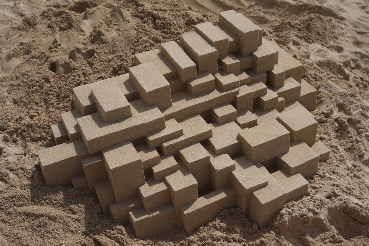 Artist Calvin Seibert builds sand structures not in the typical bucket and moat style. His creations demonstrate precision, showing modernist and classic influences in their structure. As a young boy he would make structures that looked like a building early in its construction. His influences being the houses constantly being built in his neighborhood. He realized in high school that his early structures were sculptures and went from studying as an architect to artist. Photographing his creations allowed him to see how they might evolve.